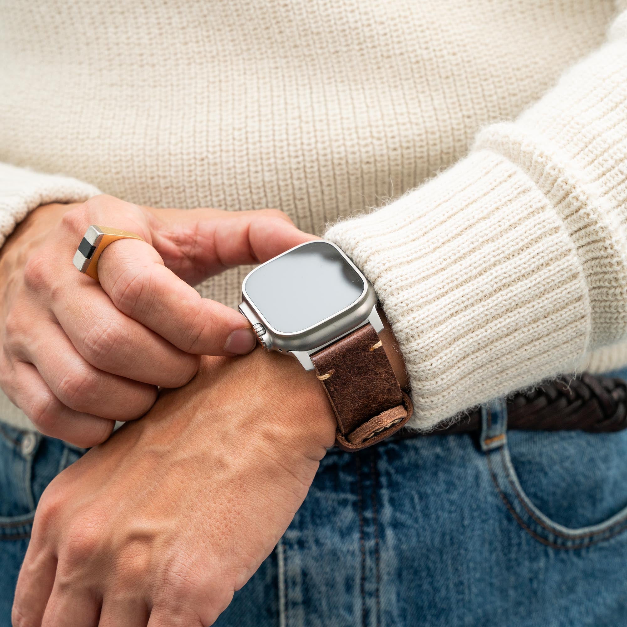 Our leather watch bands are crafted from thick and wide full-grain leather, it's ready for any adventure while offering supreme comfort, right out of the box. Over time the strap darkens and forms a subtle wrist-curve patina, visual proof of miles logged and memories made. These leather bands give your Apple Watch a more traditional watch band look.