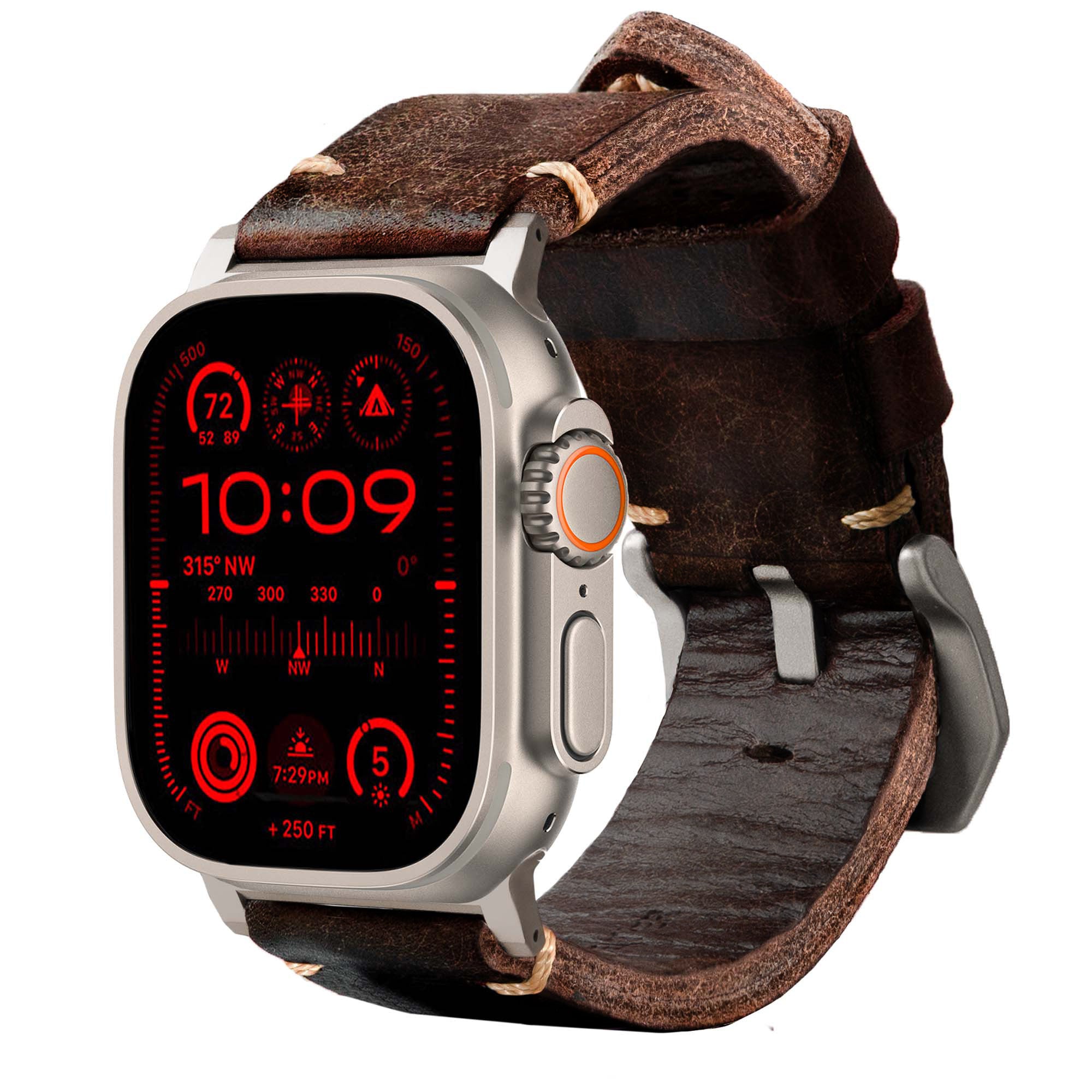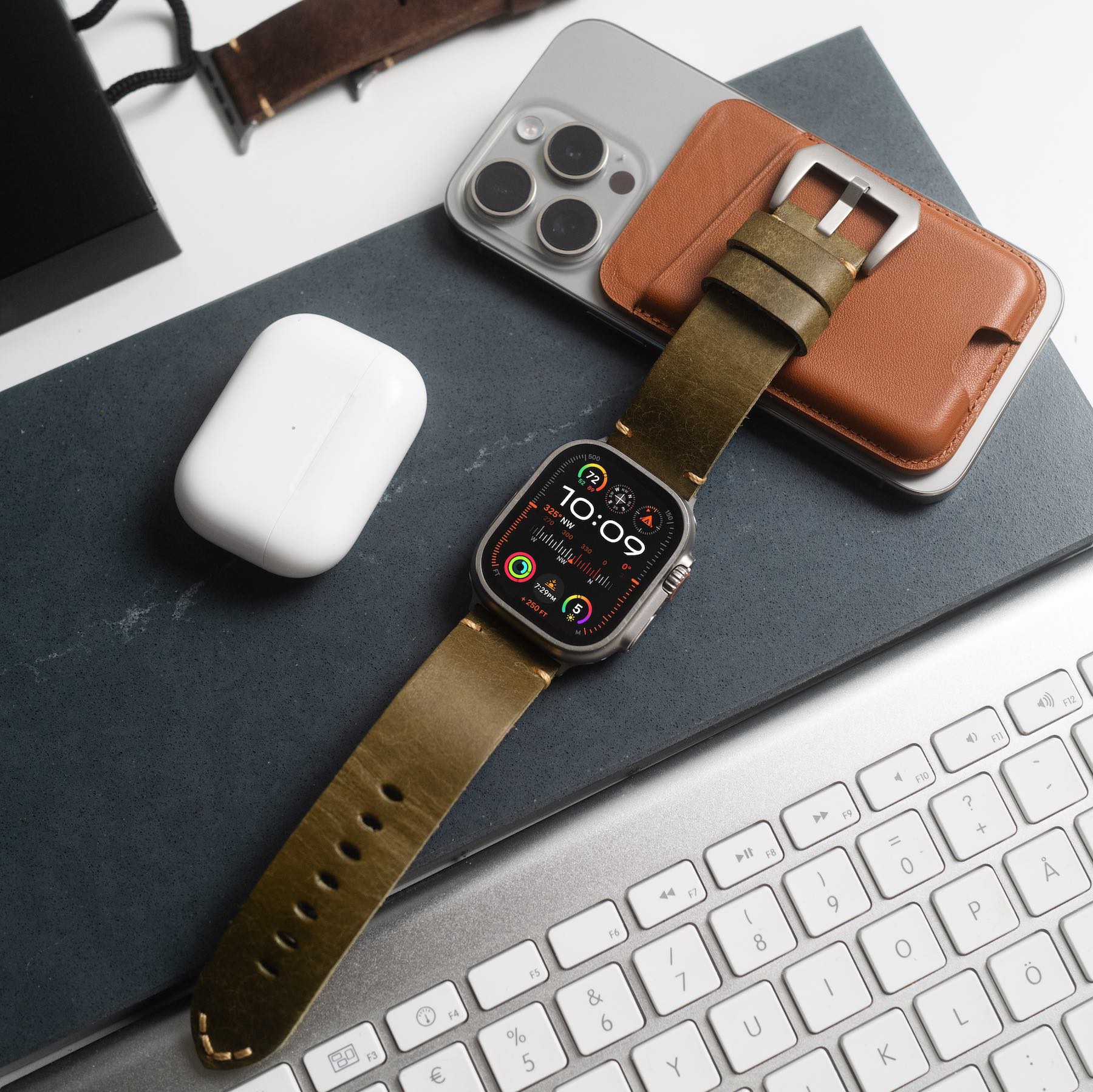 Thick and wide leather strap. Crafted from premium full-grain leather, this band brings timeless style to your Apple Watch Ultra.