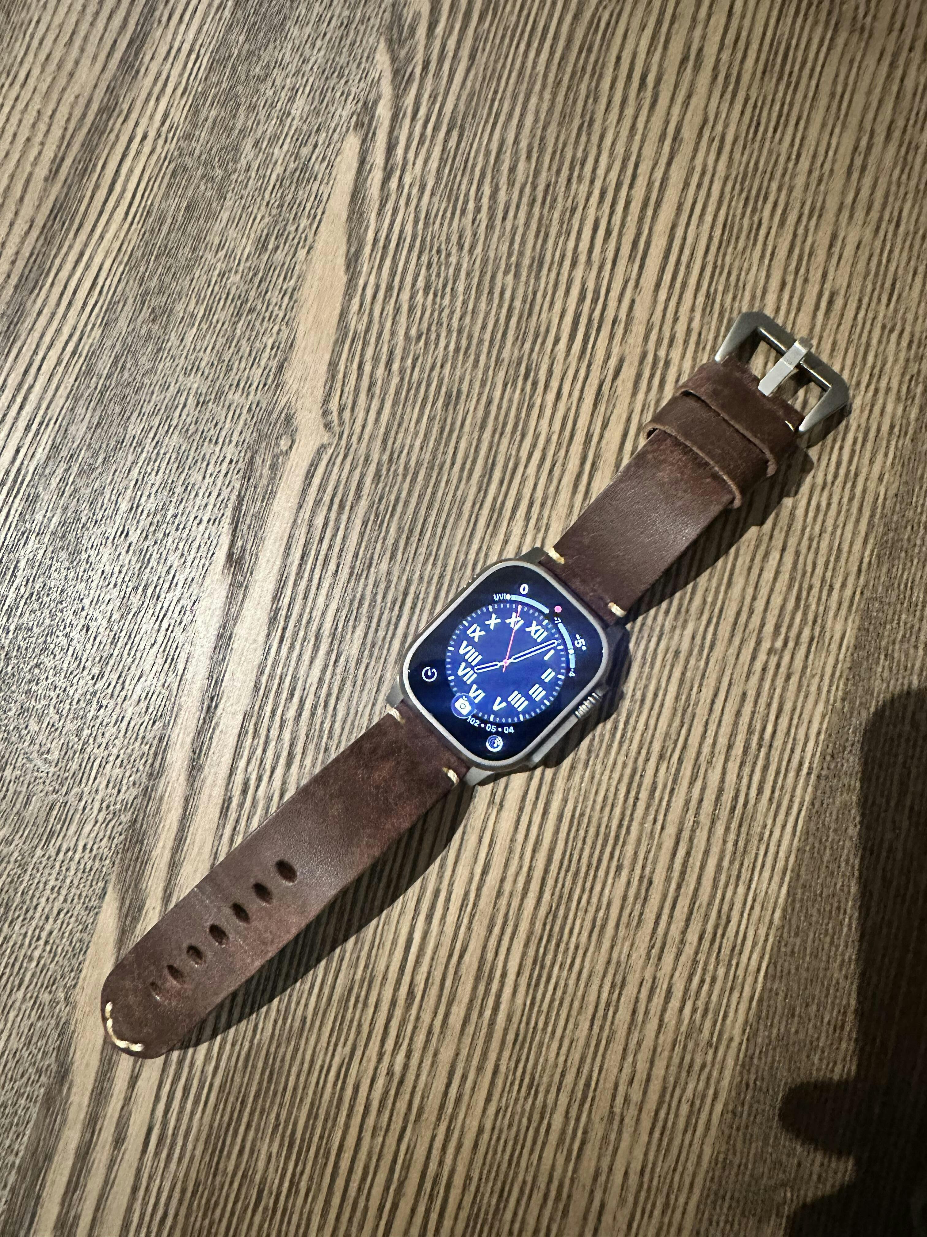 Thick and wide leather strap. Crafted from premium full-grain leather, this band brings timeless style to your Apple Watch Ultra.