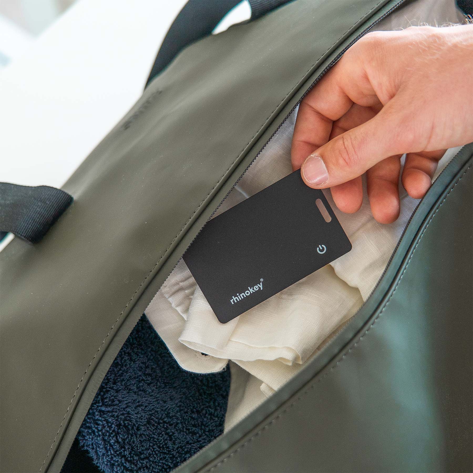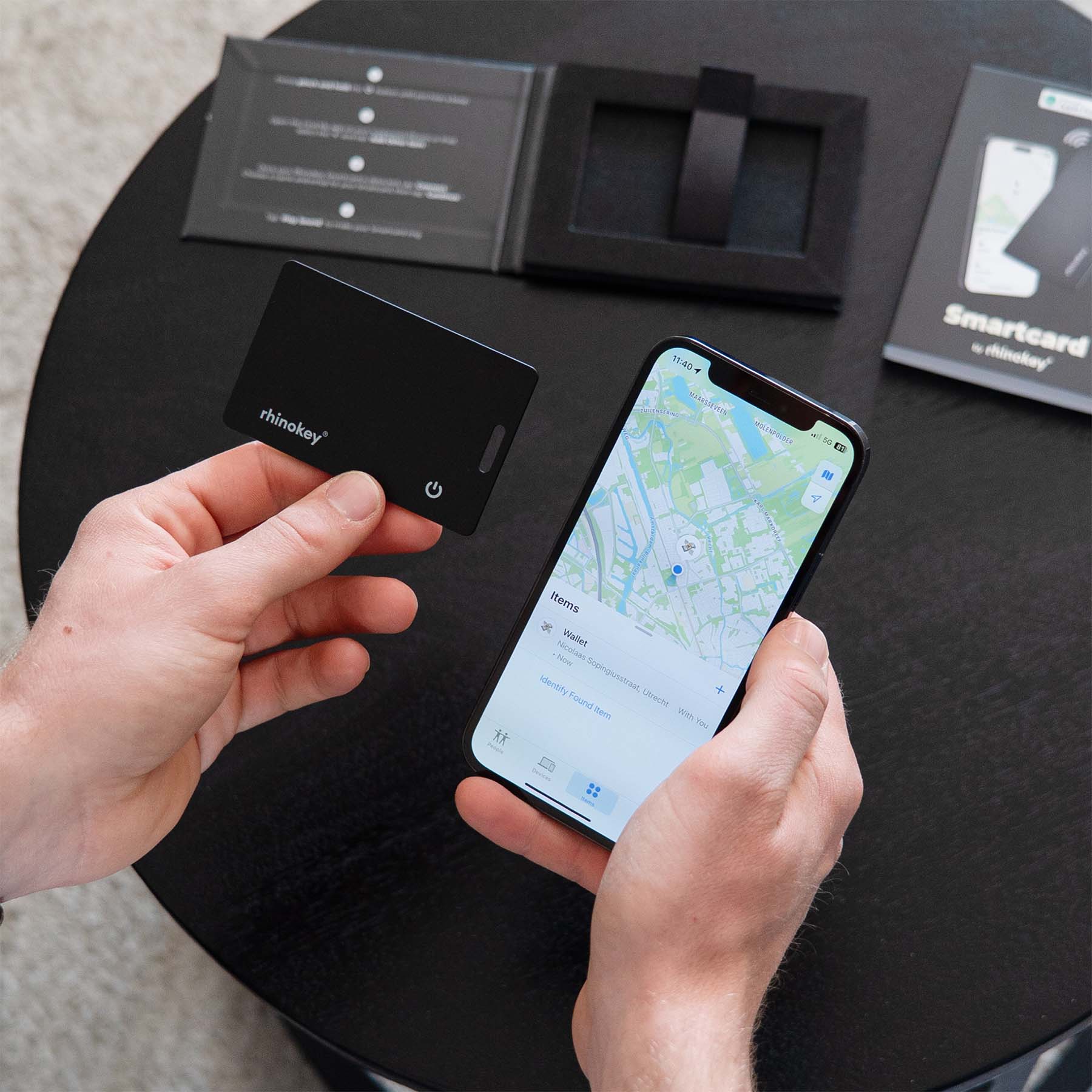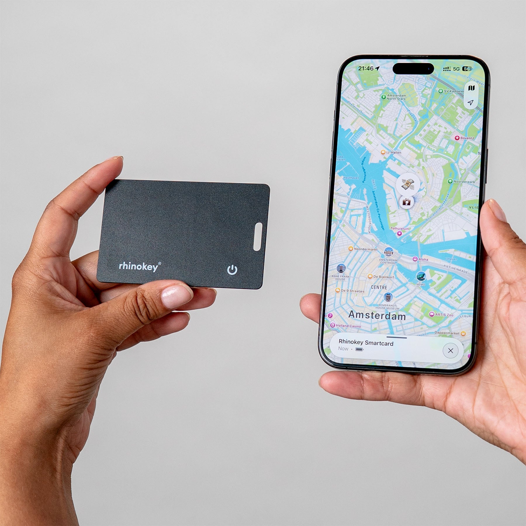 The world's thinnest trackable card by RhinoKey®, trusted by 100,000+ users. Designed in the Netherlands. Compatible with Apple Find My or Google Find Hub. Wirelessly rechargeable.